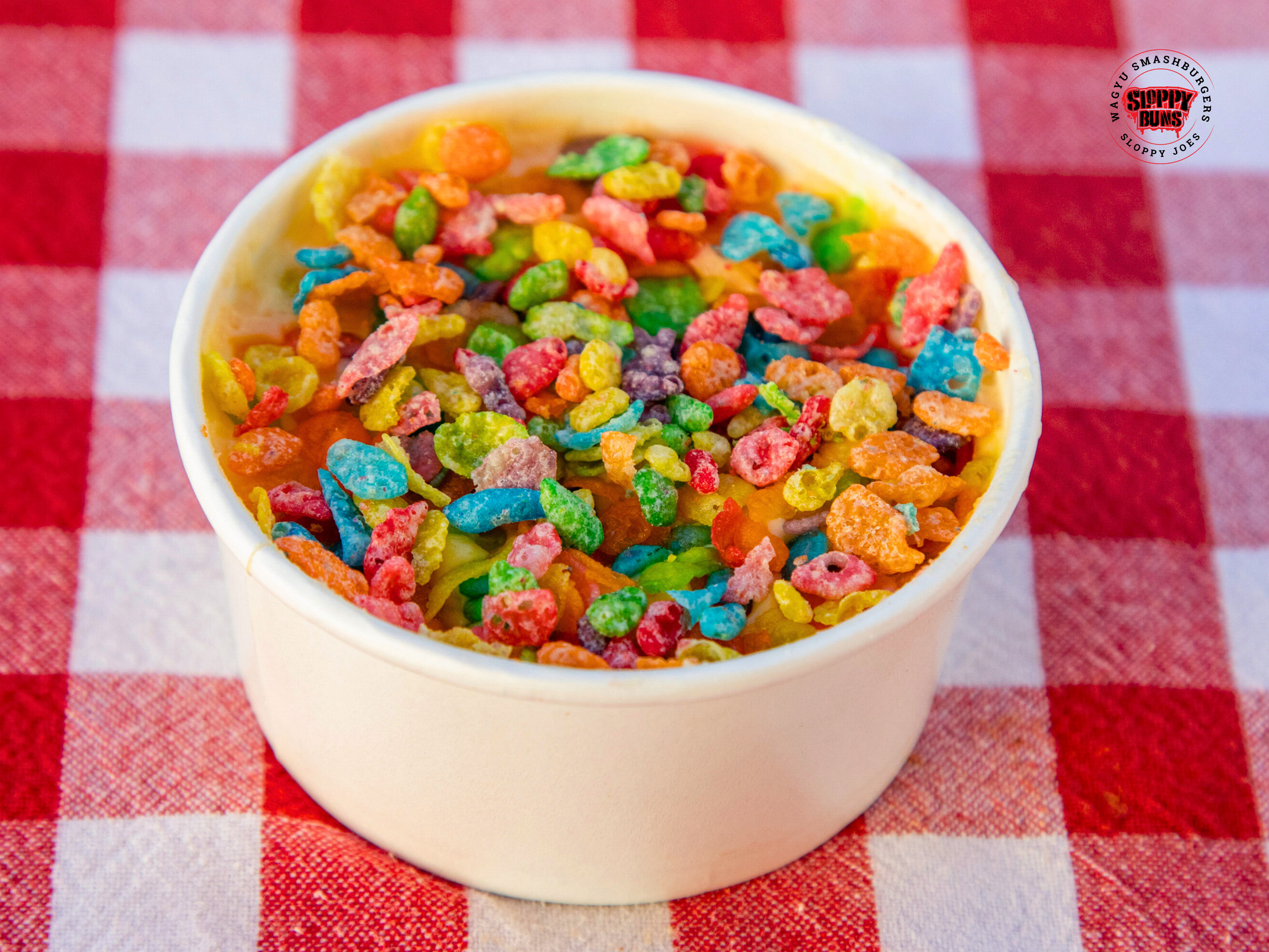 Vanilla Pudding with mixed fresh Berries over a Graham Cracker crust, topped with Fruity Pebbles