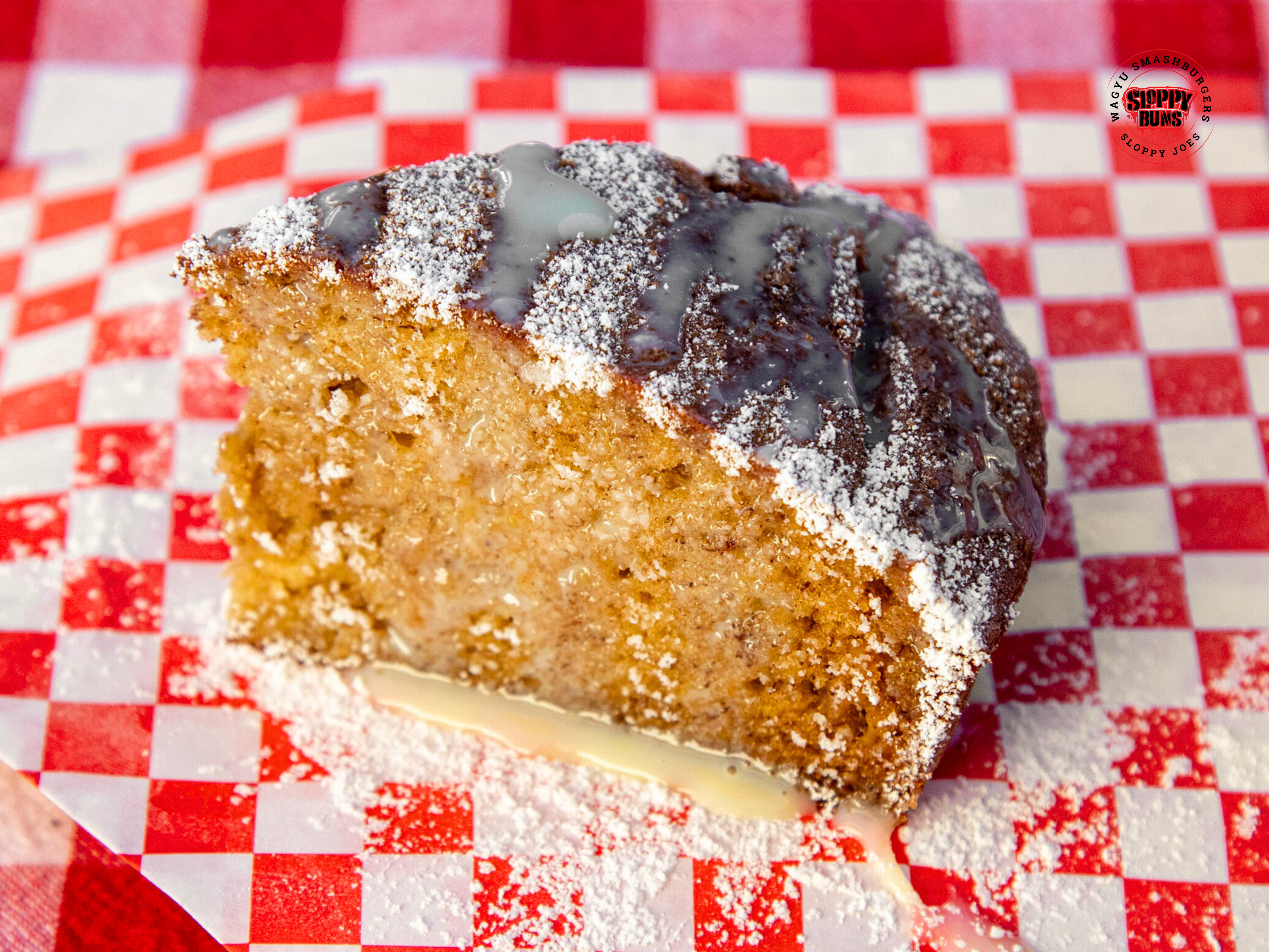Soft and Freshly-Baked Banana Bread, made to the Perfect Level of Sweetness. Each Slice is Topped with a Light Dusting of Powdered Sugar and a Drizzle of Rich, Sweet Condensed Milk